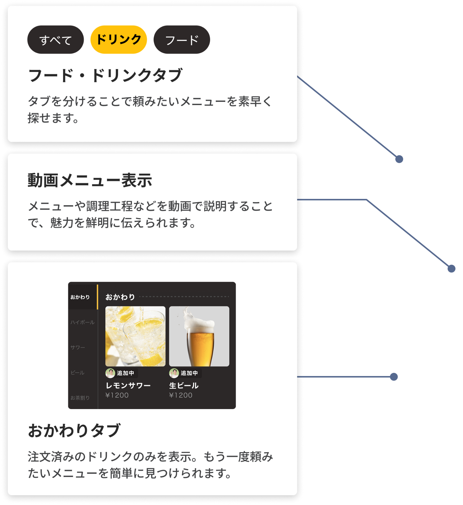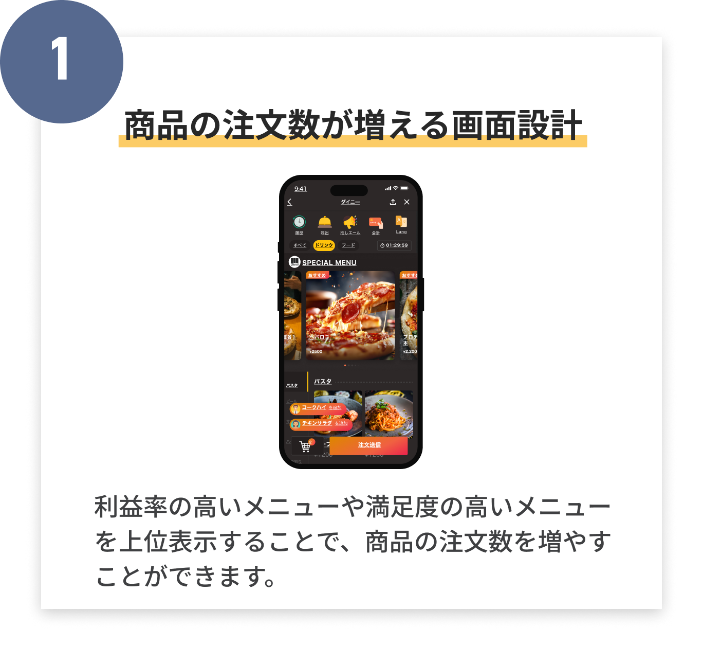 ダイニーは飲食店での顧客体験を追求しており、お客さまが「もう一品頼みたい」と思う画面設計になっています。 商品の注文数が増え、客単価UPを実現します!