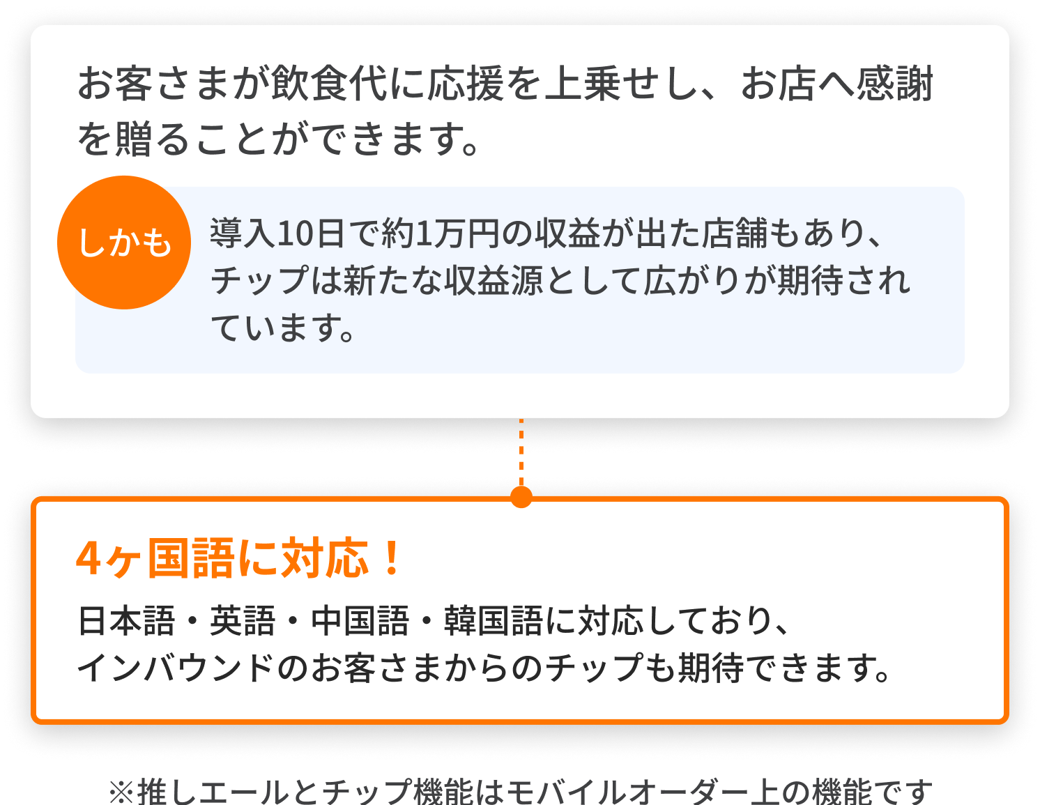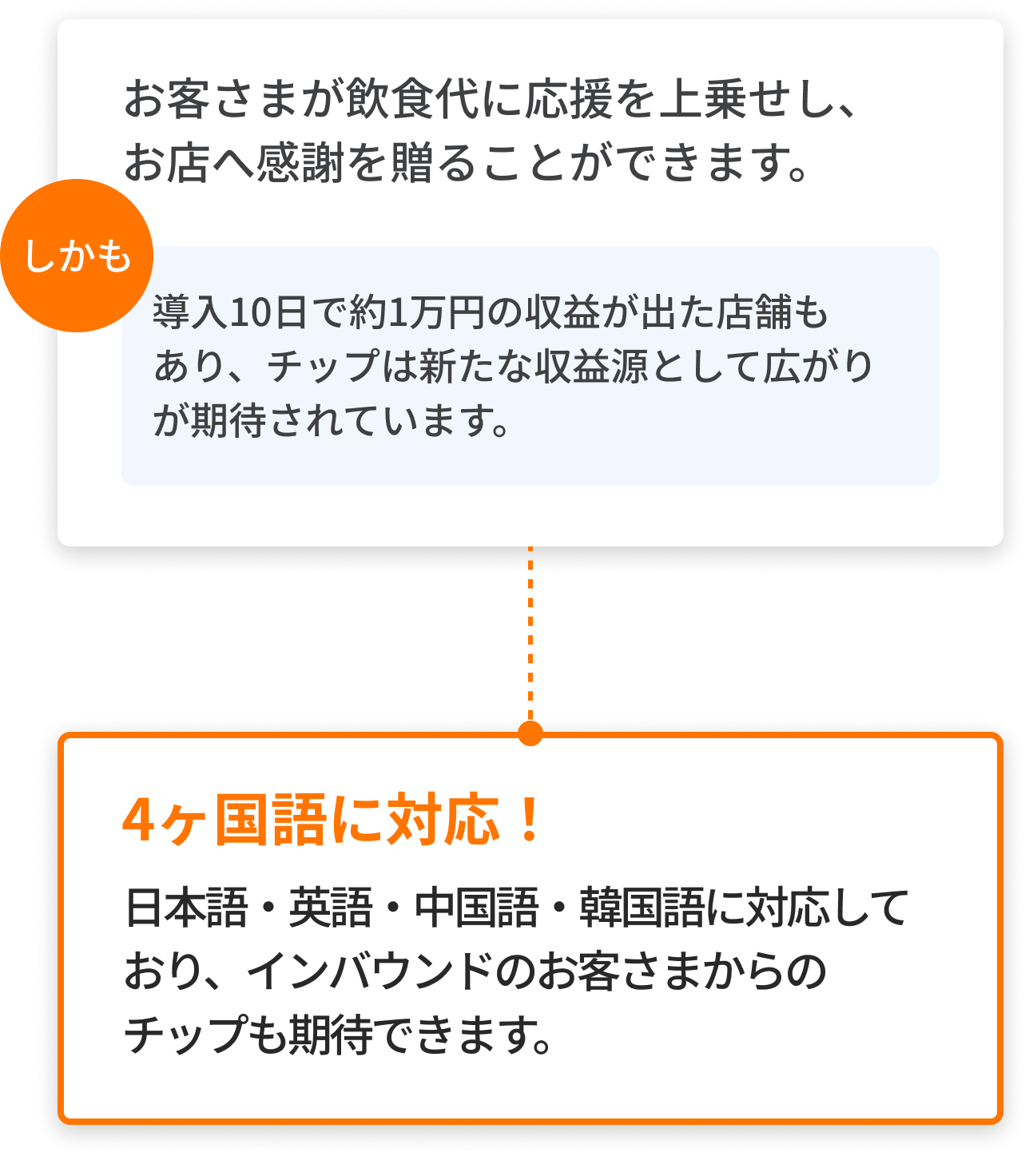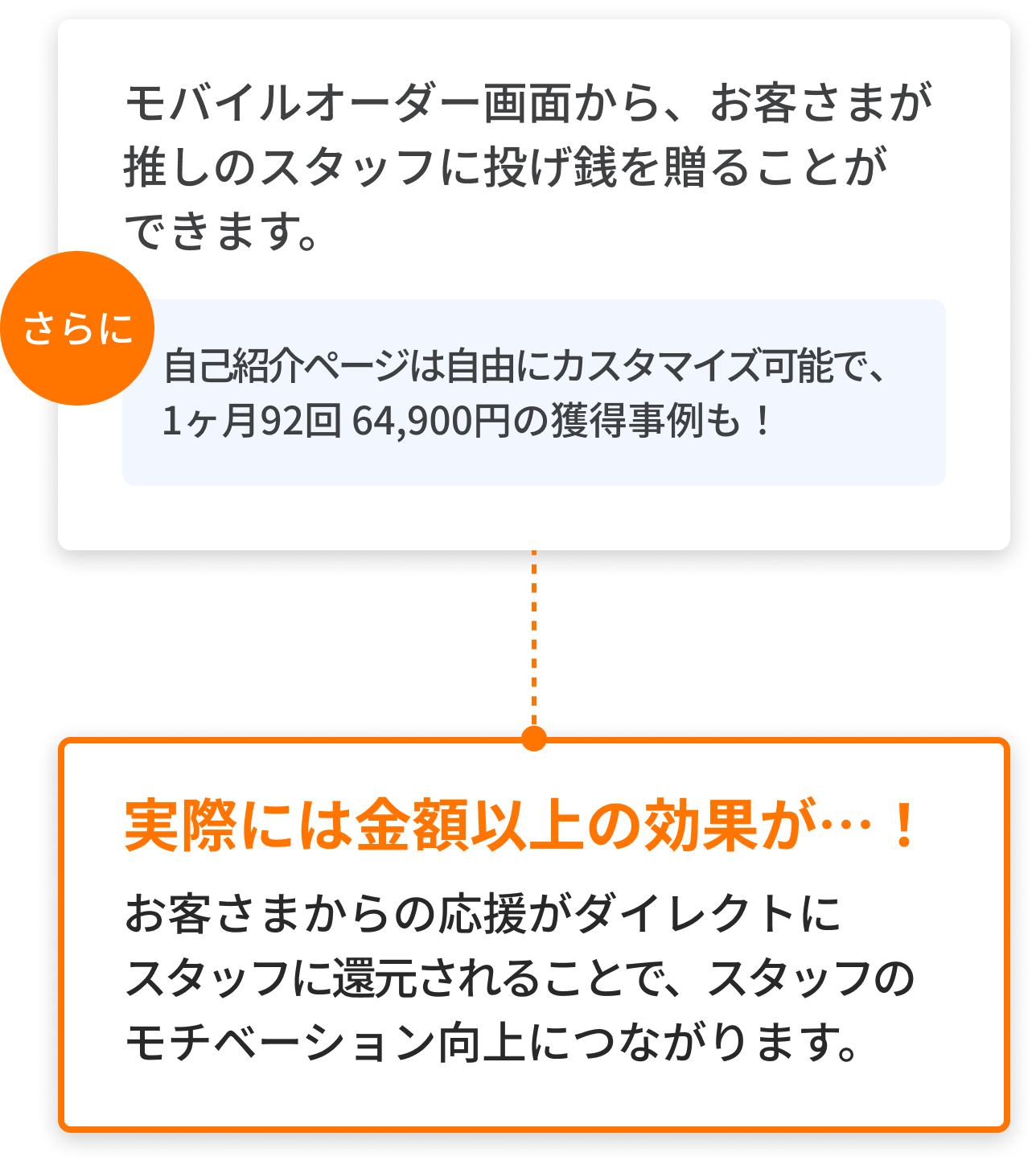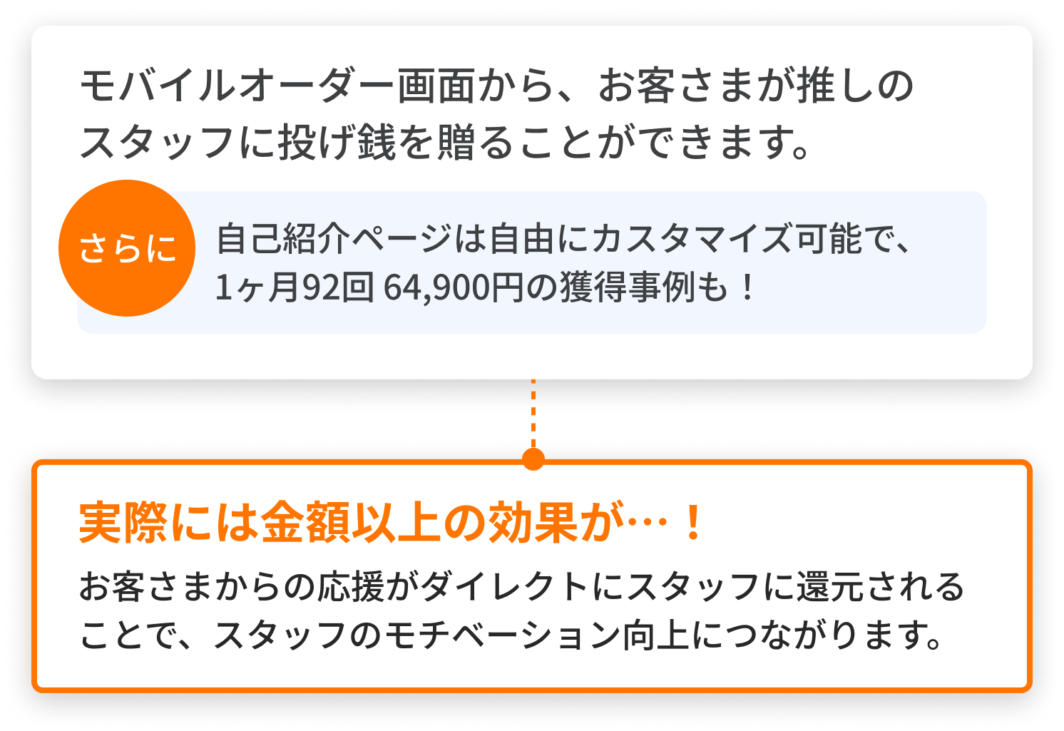 お客さまが推しのスタッフへ投げ銭、店舗にチップを贈ることが可能。「商品以外のサービス」に対する対価を受け取ることができます。