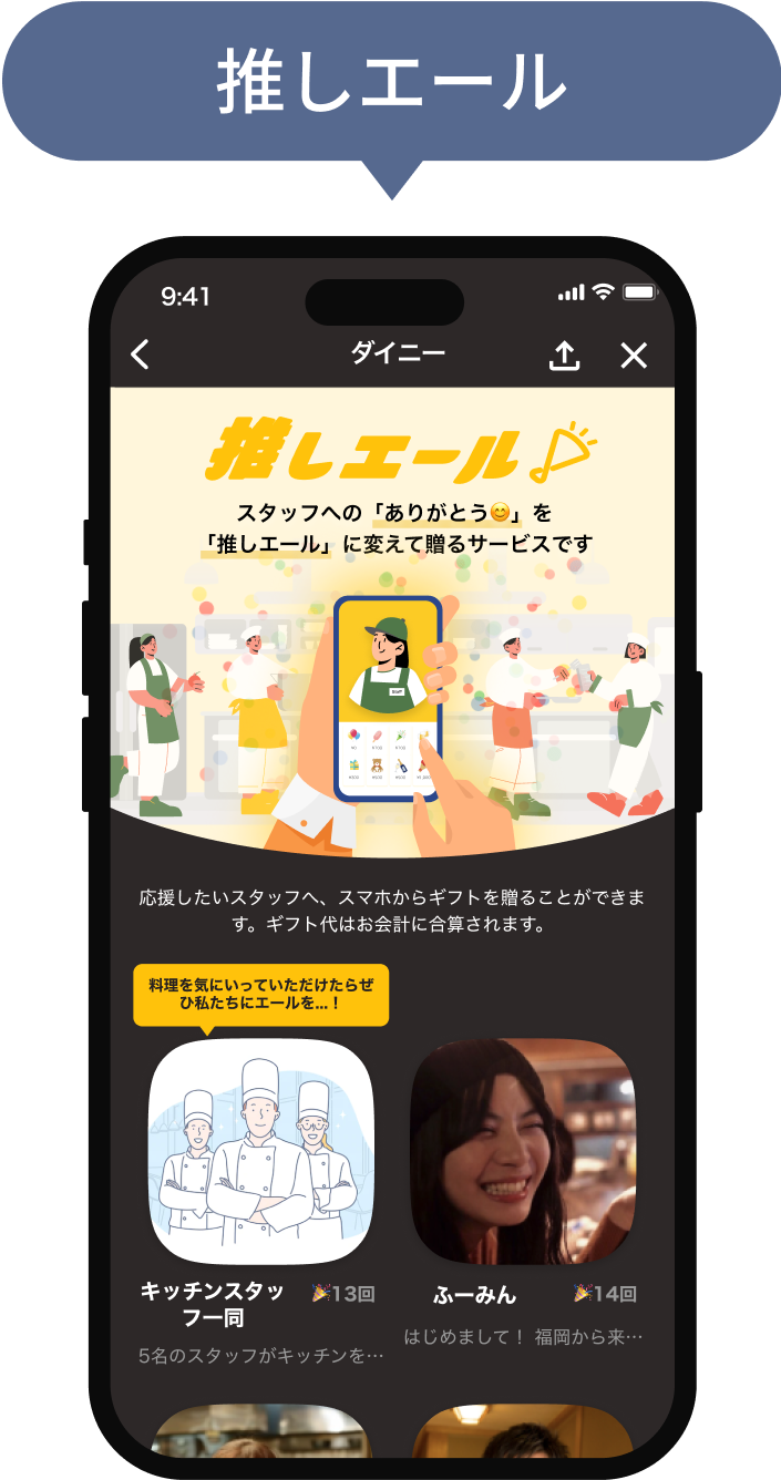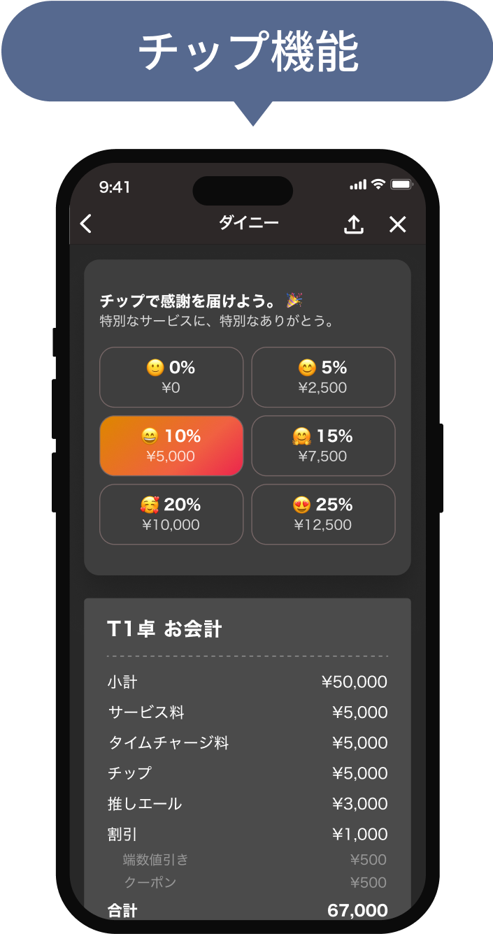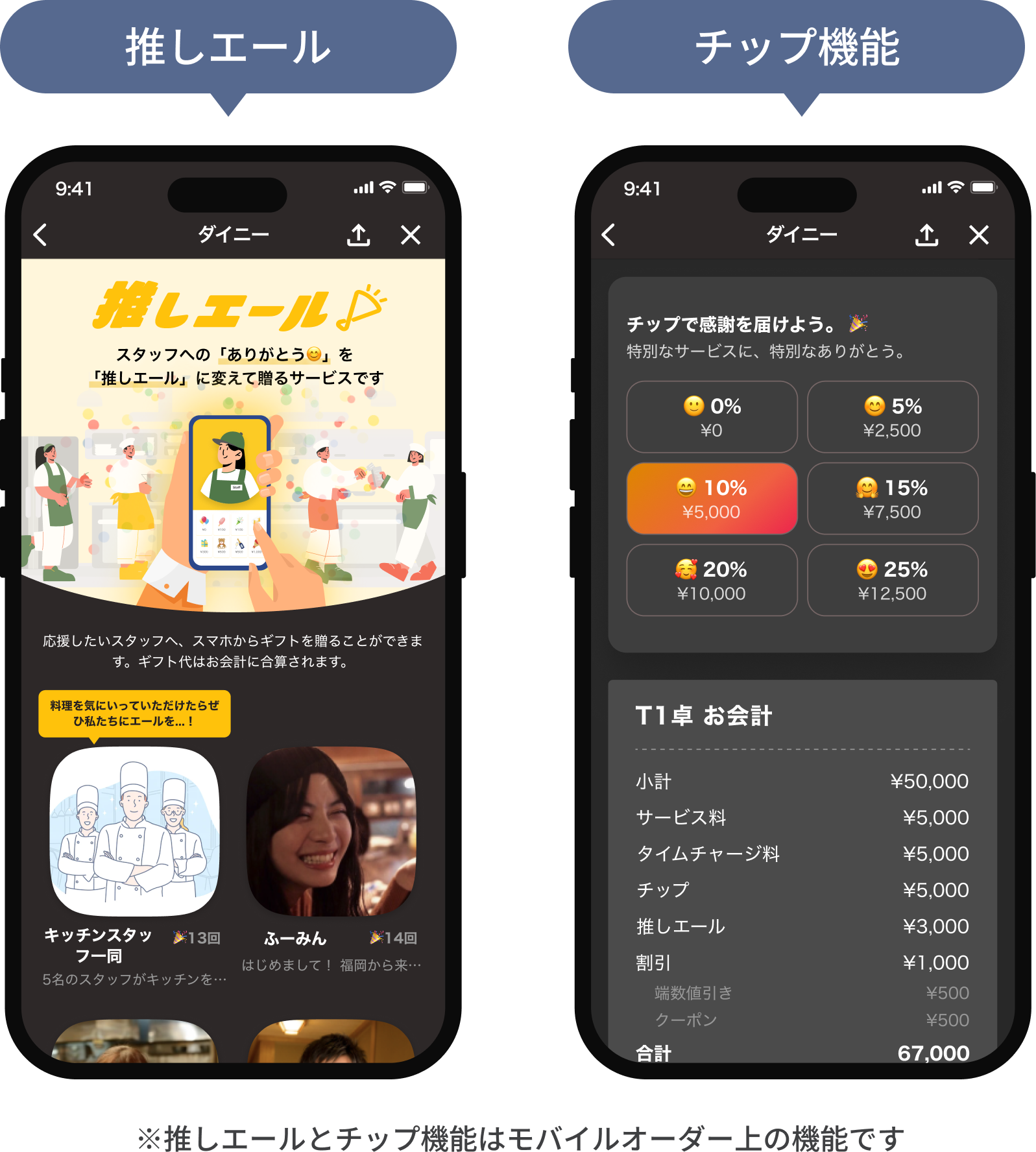 お客さまが推しのスタッフへ投げ銭、店舗にチップを贈ることが可能。
