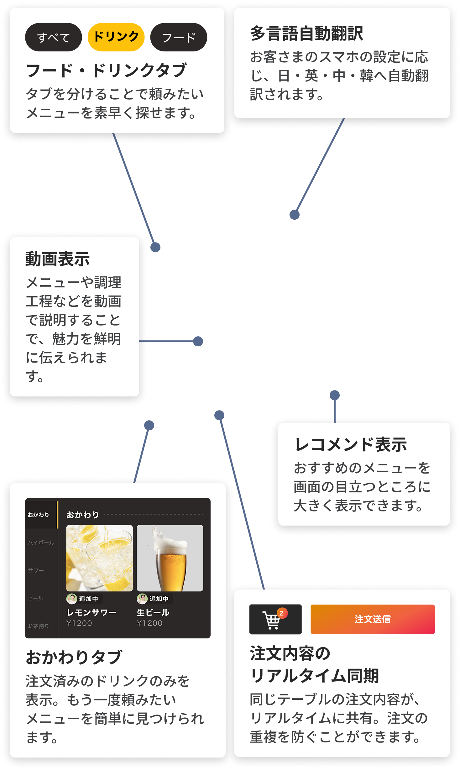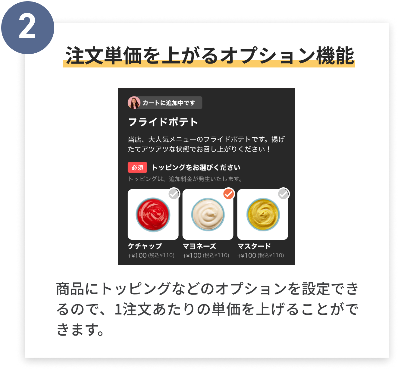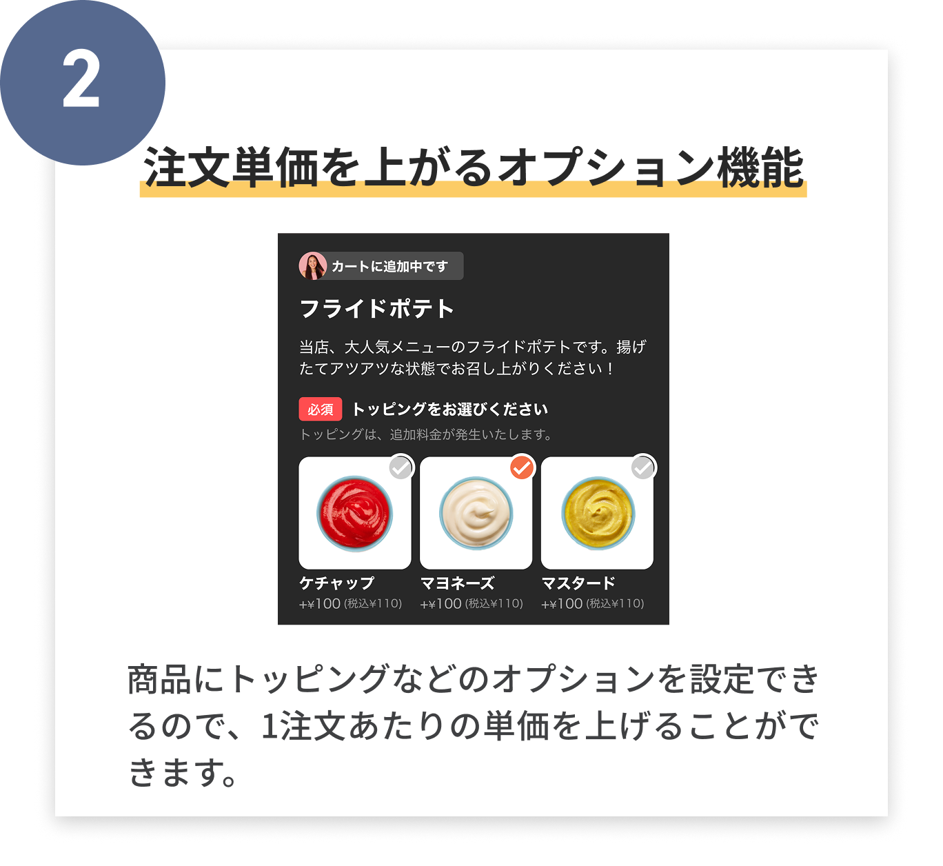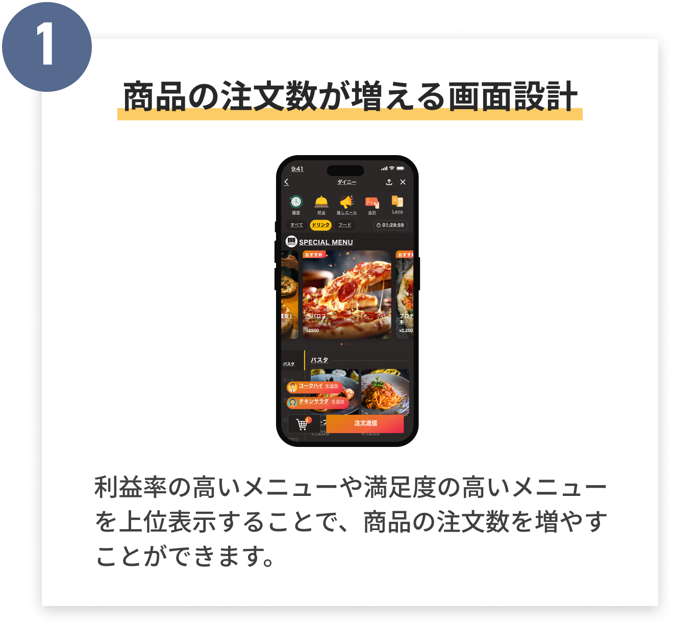 お客さまが「もう一品頼みたい」と思う画面設計になっています。