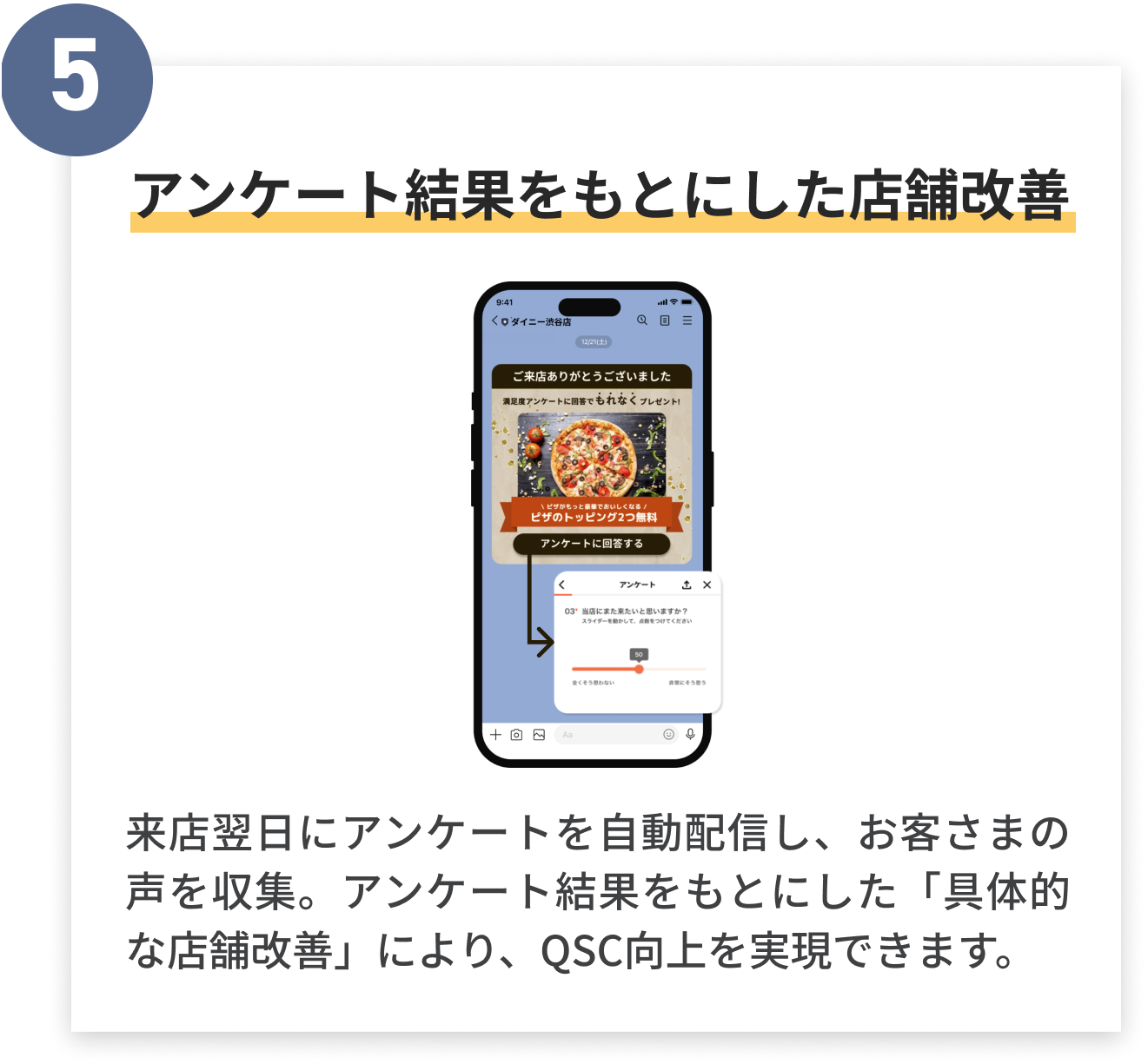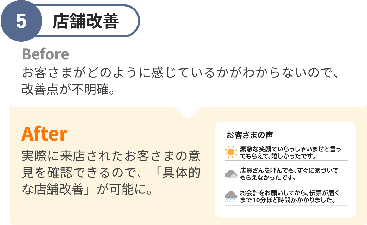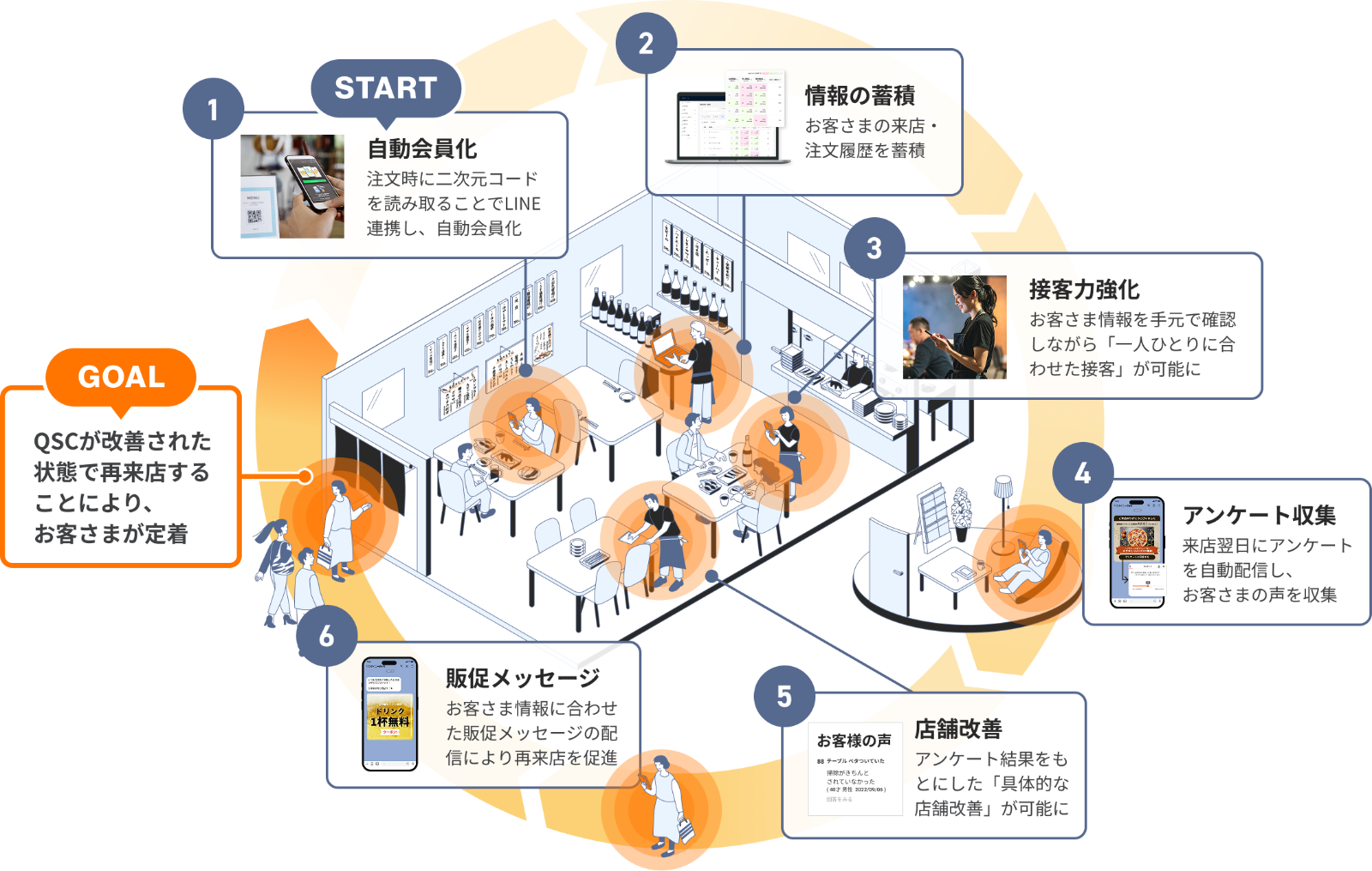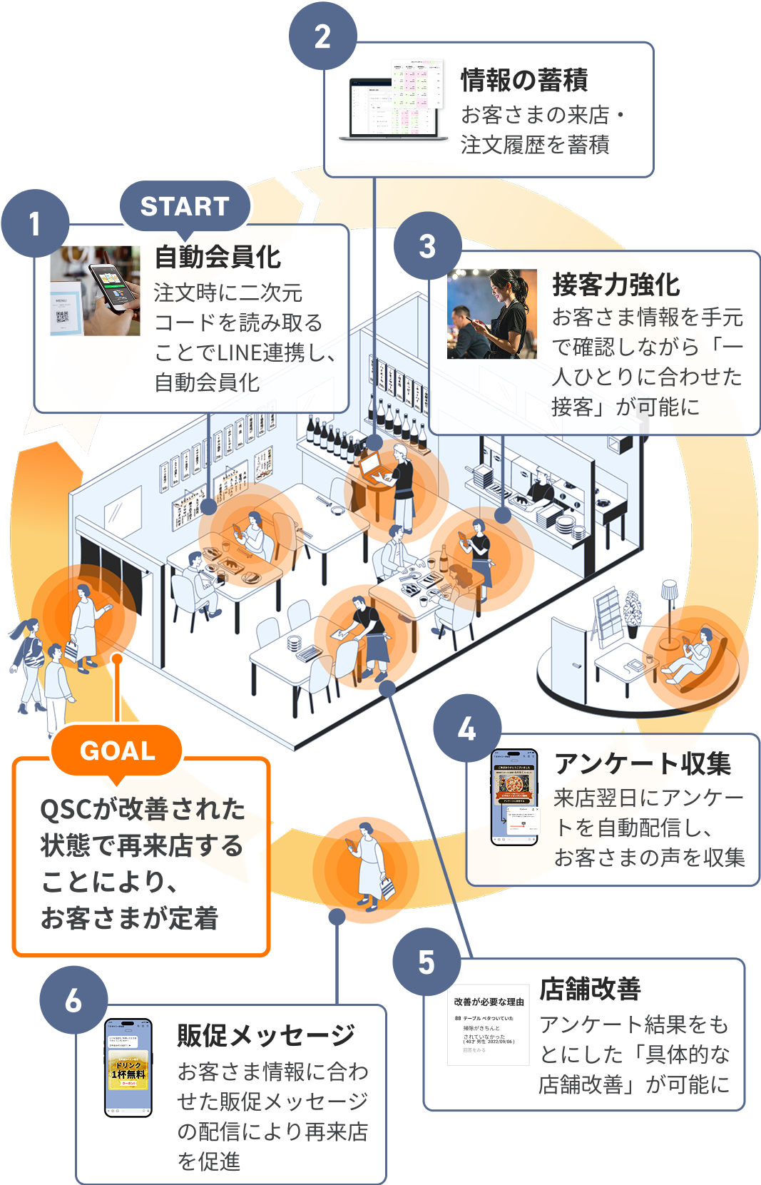 蓄積されたデータを店舗改善に活用することで、 QSCを向上させ、リピーターを増やすことができます!
