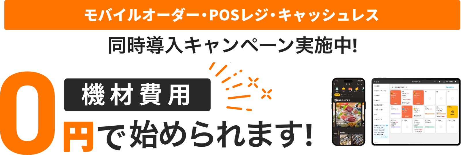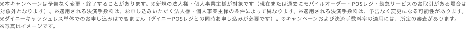 ※本キャンペーンは予告なく変更・終了することがあります。 ※新規の法人様・個人事業主様が対象です(現在または過去にモバイルオーダー・POSレジ・勤怠サービスのお取引がある場合は対象外となります)。 ※適用される決済手数料は、お申し込みいただく法人様・個人事業主様の条件によって異なります。 ※適用される決済手数料は、予告なく変更になる可能性があります。 ※ダイニーキャッシュレス単体での申し込みはできません(ダイニーPOSレジとの同時お申し込みが必要です)。 ※キャンペーンおよび決済手数料率の適用には、所定の審査があります。 ※写真はイメージです。