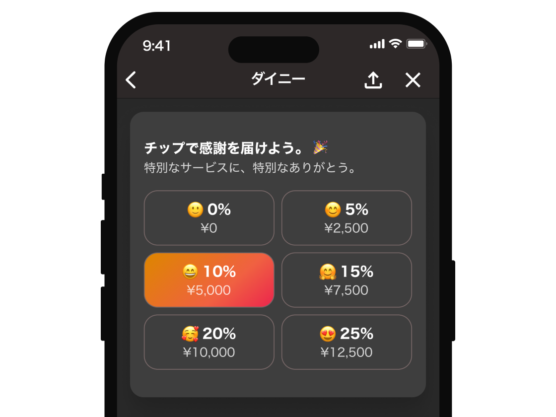 通常の飲食代とは別に、モバイルオーダー上で「サービスへの感謝の気持ち」や「お心づけ」として“チップ”を贈ることができます。 利用の有無は各店舗が自由に選定でき、強制するものではありません。「0~25%」のチップ料率をお客さまが自由に選択できます。